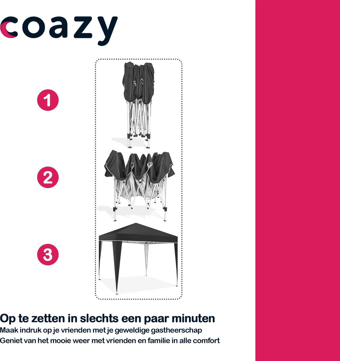 Jouw Coazy Partytent is zeer eenvoudig te monteren en te demonteren – geen speciaal gereedschap nodig! Dankzij de metalen stutten is hij gemakkelijk in drie verschillende hoogtes te verstellen, zodat je hem kunt aanpassen aan je ruimte. Bovendien zorgen de meegeleverde haringen en scheerlijnen ervoor dat je tent zelfs in de meest winderige omstandigheden stevig staat.