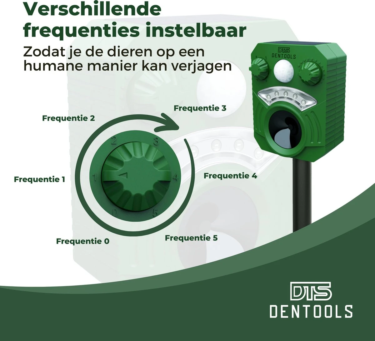Onze Dentools kattenverjager biedt u de mogelijkheid aan om de frequentie te verstellen. De relevantie van deze optie is cruciaal, omdat de verschillende ongedierte, verschillende frequentie vereisen om effectief verdreven te worden!