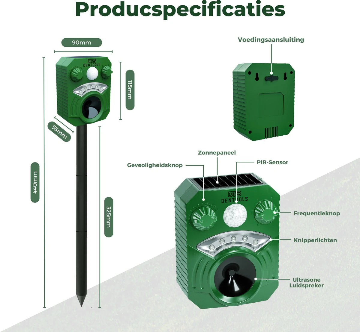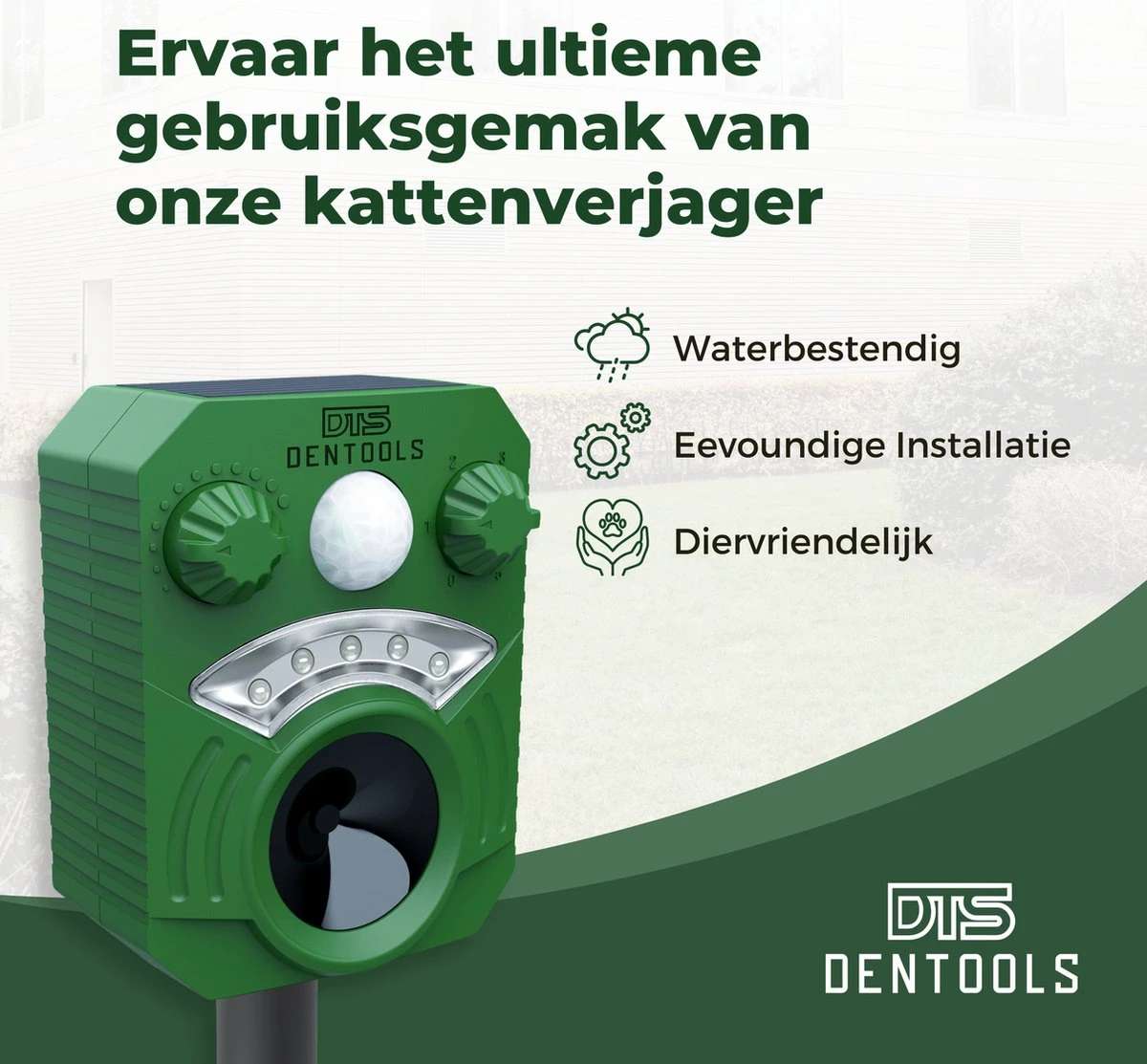 Onze nieuwe Dentools kattenverjager verjaagt alle ongewenste dieren en ongedierte. Dit voldoet onze verjager door krachtige ultrasonische geluiden/signalen uit te zenden. Deze signalen zijn zo onaangenaam voor deze ongewenste bezoekers, dat ze voorgoed weg blijven. Alhoewel het onaangenaam voor ze is, is het niet schadelijk voor de dieren/ongedierte.