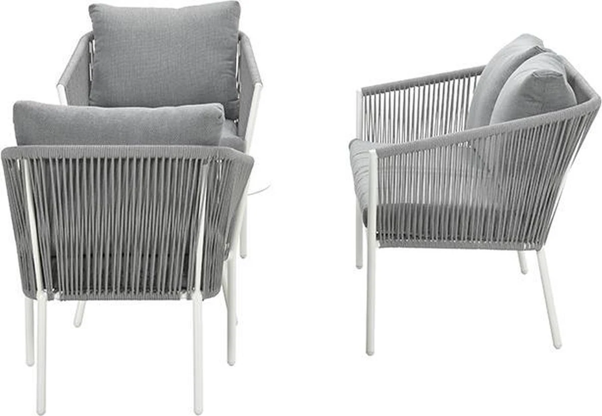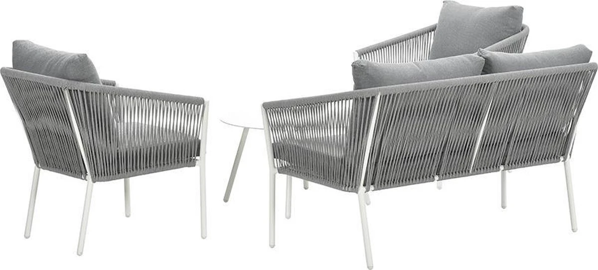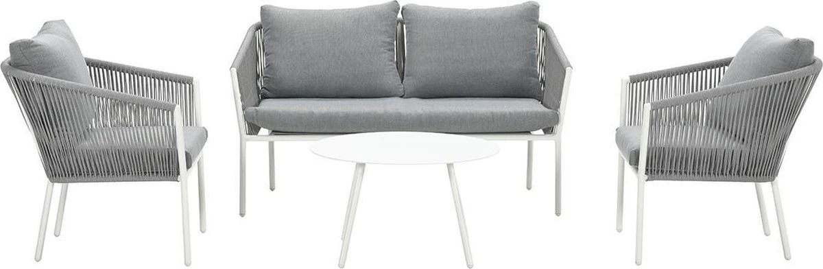De loungeset heeft een aluminium frame, welke gecoat is. Hierdoor is de set onderhoudsvriendelijk en weerbestendig. In de arm- en rugleuning zit rope verwerkt. Dit is een kunststof touw dat een speels effect geeft aan de loungeset. Rope is een trendy materiaal wat steeds meer gebruikt wordt in tuinmeubelen. Het touw is sterk en onderhoudsvriendelijk. De meegeleverde kussens hebben een waterafstotende coating en afritsbare kussenhoezen.