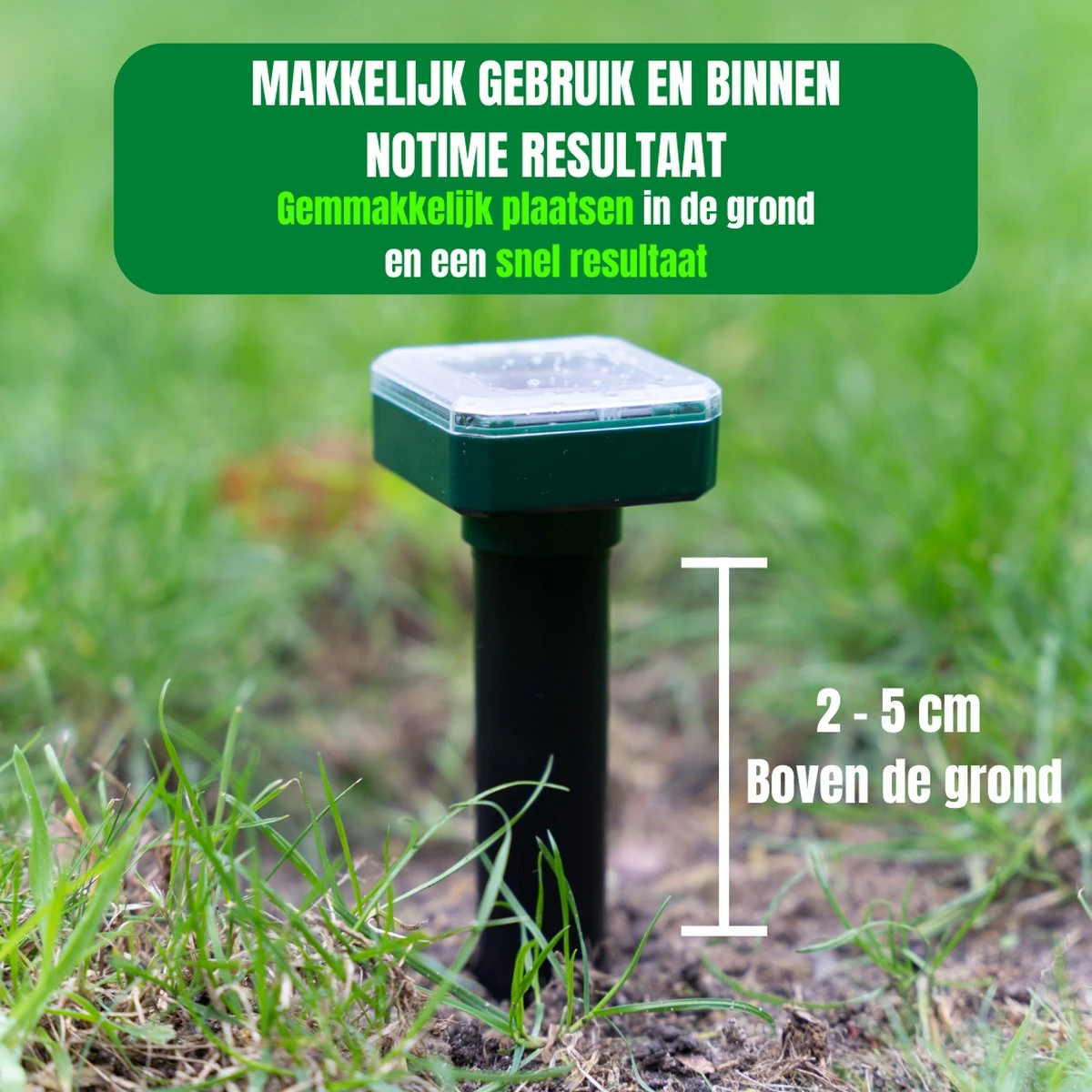 De mollenverjagers werken op zonne-energie en zijn vrij van batterijen. Zo los je een probleem dus erg milieuvriendelijk op! Dankzij de sterke kracht van de zonnepanelen komt het ultrasone geluid goed naar voren en werken de mollenverjagers optimaal. Ook wanneer het bewolkt is of regent, zullen de mollenverjagers gewoon werken! Het zonlicht komt gewoon door de wolken heen bovenop jouw mollenverjager.