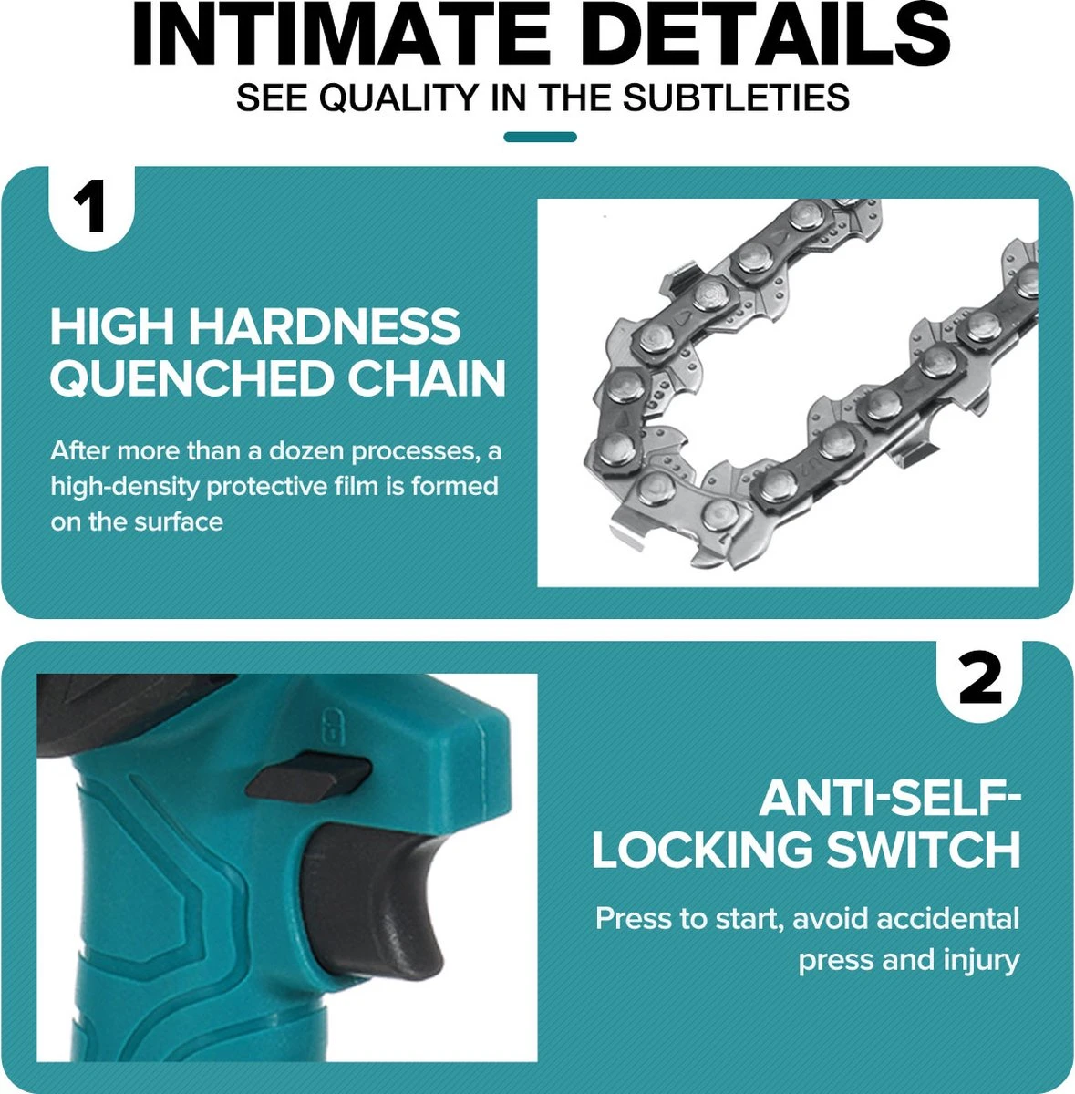 - l Hoogwaardige geleidingsketting, diep blussen, slijtvast, soepel snijden.