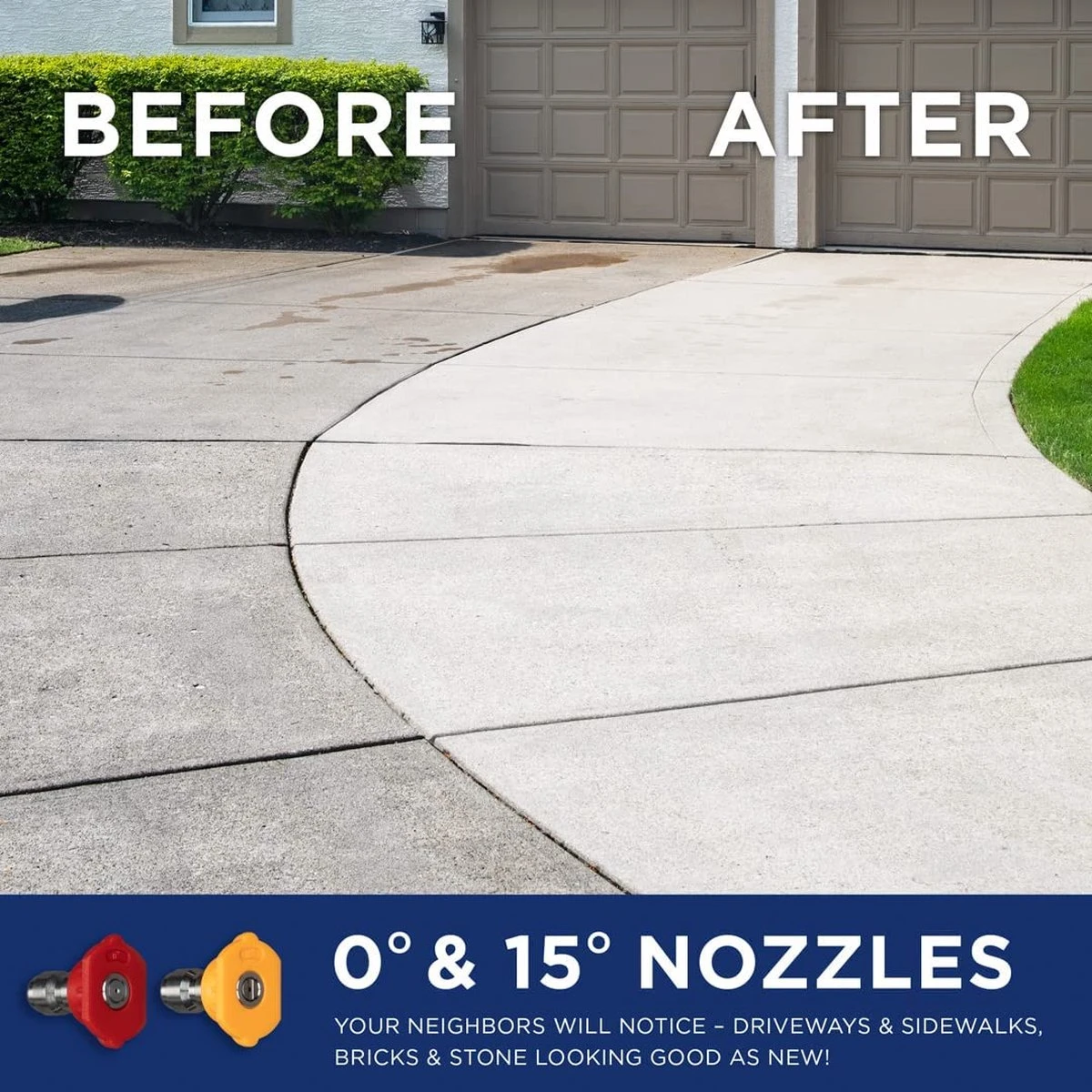 - Nozzle-assortiment: 0°, 15°, 25°, 40°, en zeep